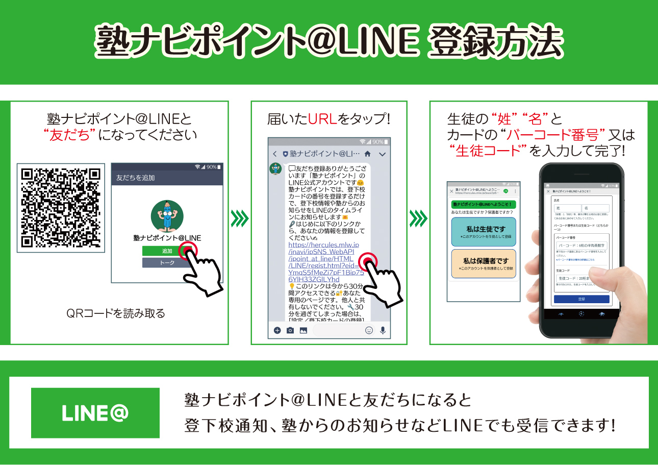 LINEで「登下校メール」や「一斉メール」を受信するには“保護者様”が「塾ナビポイント@LINE」公式アカウントと「友だち」登録をして頂く必要があります。塾ナビポイント管理WEBサイトで保護者様のLINEアカウントの登録や変更を行うことはできません。